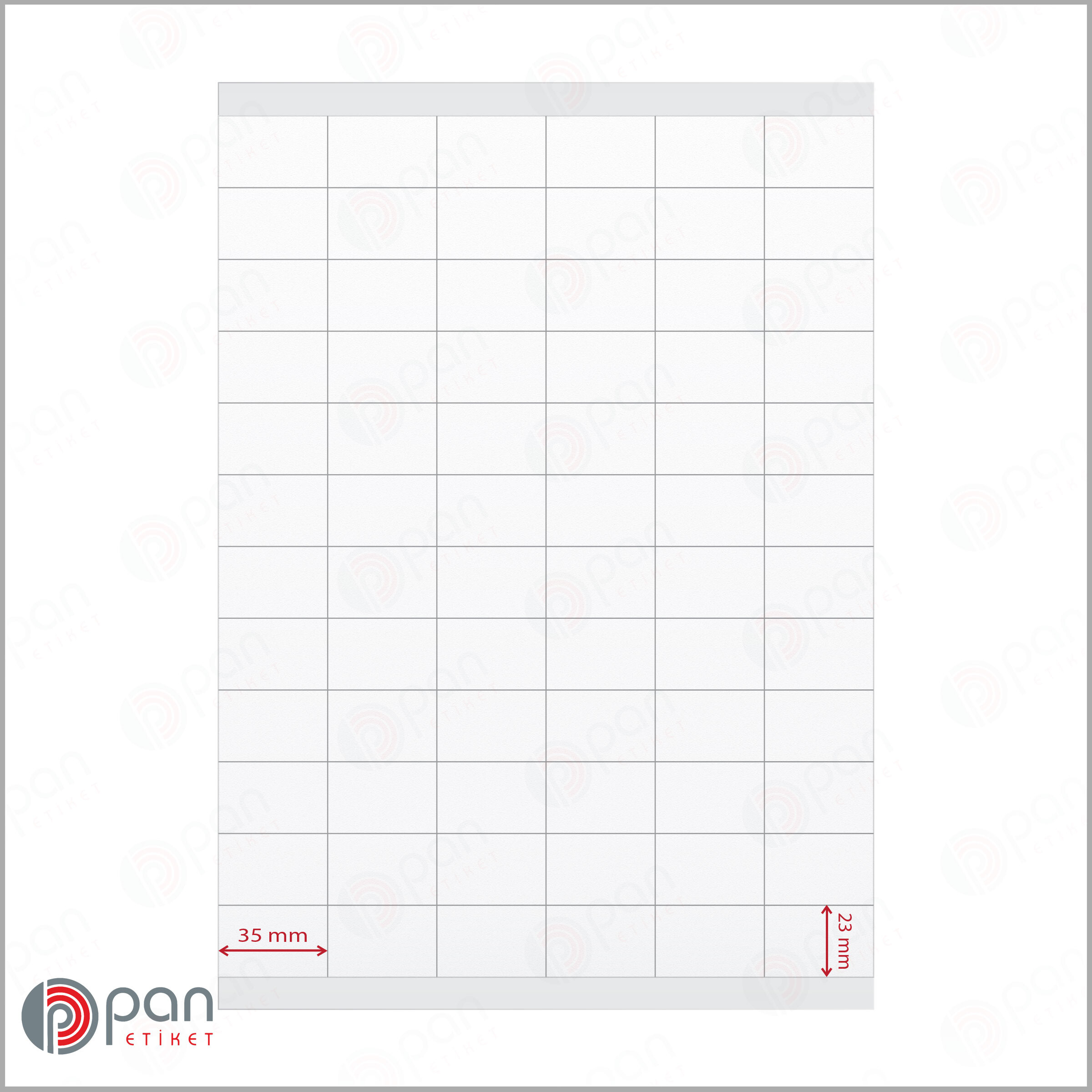 35×23 mm ölçülerinde bir sayfada 72 adet olarak sıralanmış bu etiket, görseldeki gibidir. Her bir sayfada 72 adet etiket ve her bir pakette 100 sayfa etiket mevcuttur. Bir paket içerisinde toplam 100 sayfa = 35 x 23 ölçülerinde 7.200 adet etiket mevcuttur.