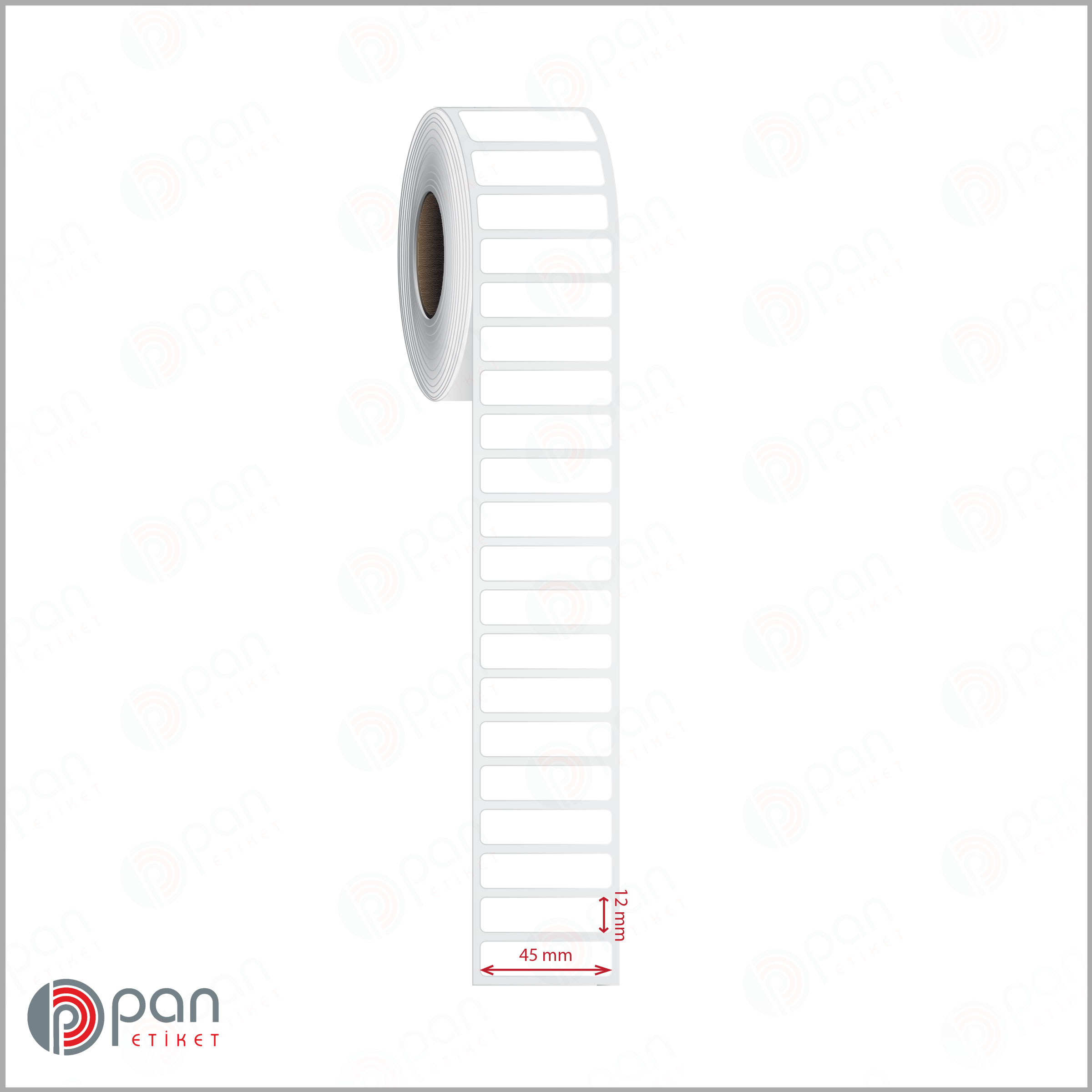 45×12 mm ölçülerindeki bu yapışkanlı rulo etiketin, rulo genişliği kenar boşlukları dahil ortalama olarak 49-51 mm ‘dir. Sipariş öncesinde barkod yazıcı cihazınızın bu genişlikte etiket rulosu kullanabildiğinden emin olunuz.