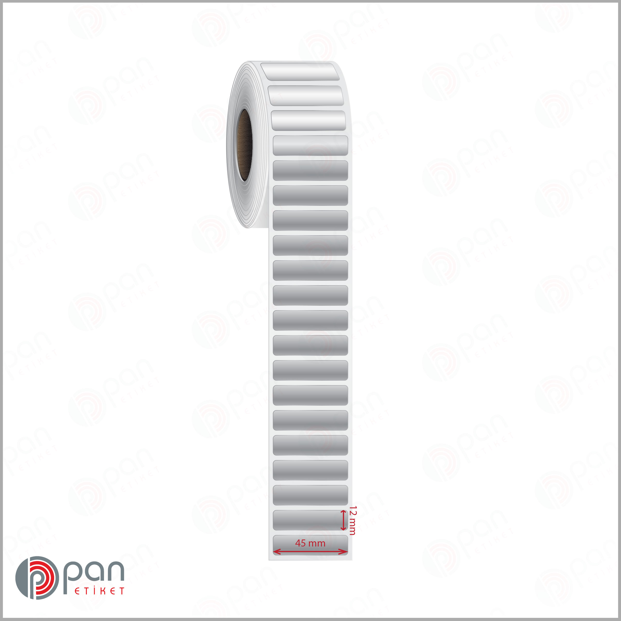 45×12 mm (4,5 x 1,2 cm) ölçülerinde, yapışkanlı barkod etiketi