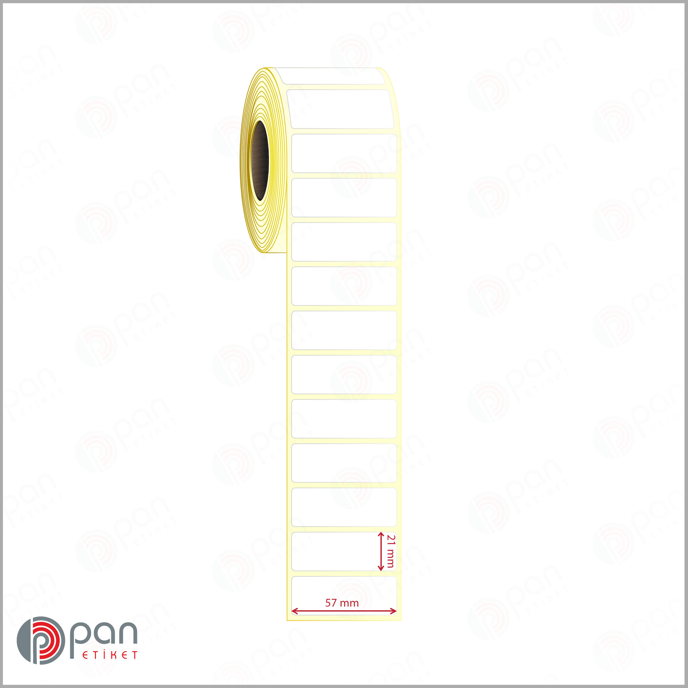 57×21 mm ölçülerindeki bu yapışkanlı rulo etiketin, rulo genişliği kenar boşlukları dahil ortalama olarak 61-631 mm ‘dir. Sipariş öncesinde barkod yazıcı cihazınızın bu genişlikte etiket rulosu kullanabildiğinden emin olunuz.