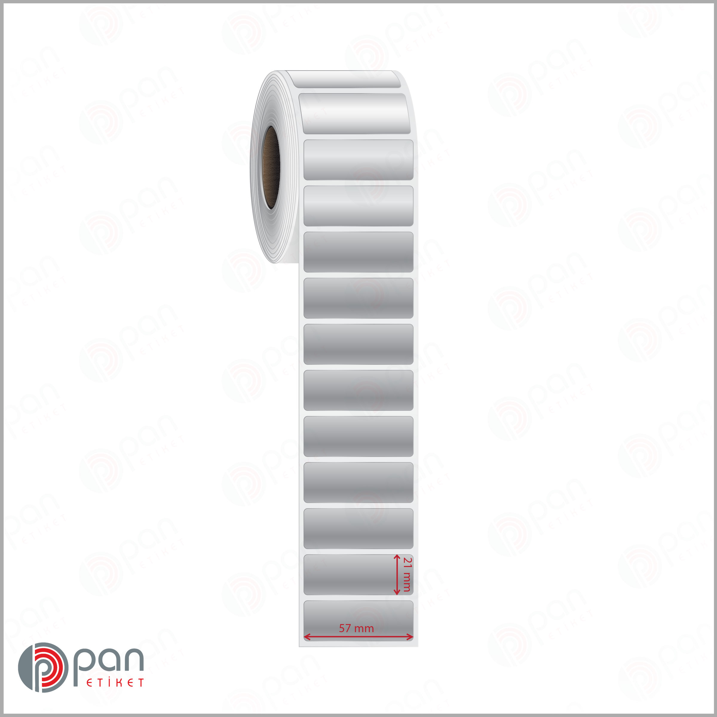 57×21 mm (5,7 x 2,1 cm) ölçülerinde, yapışkanlı barkod etiketi