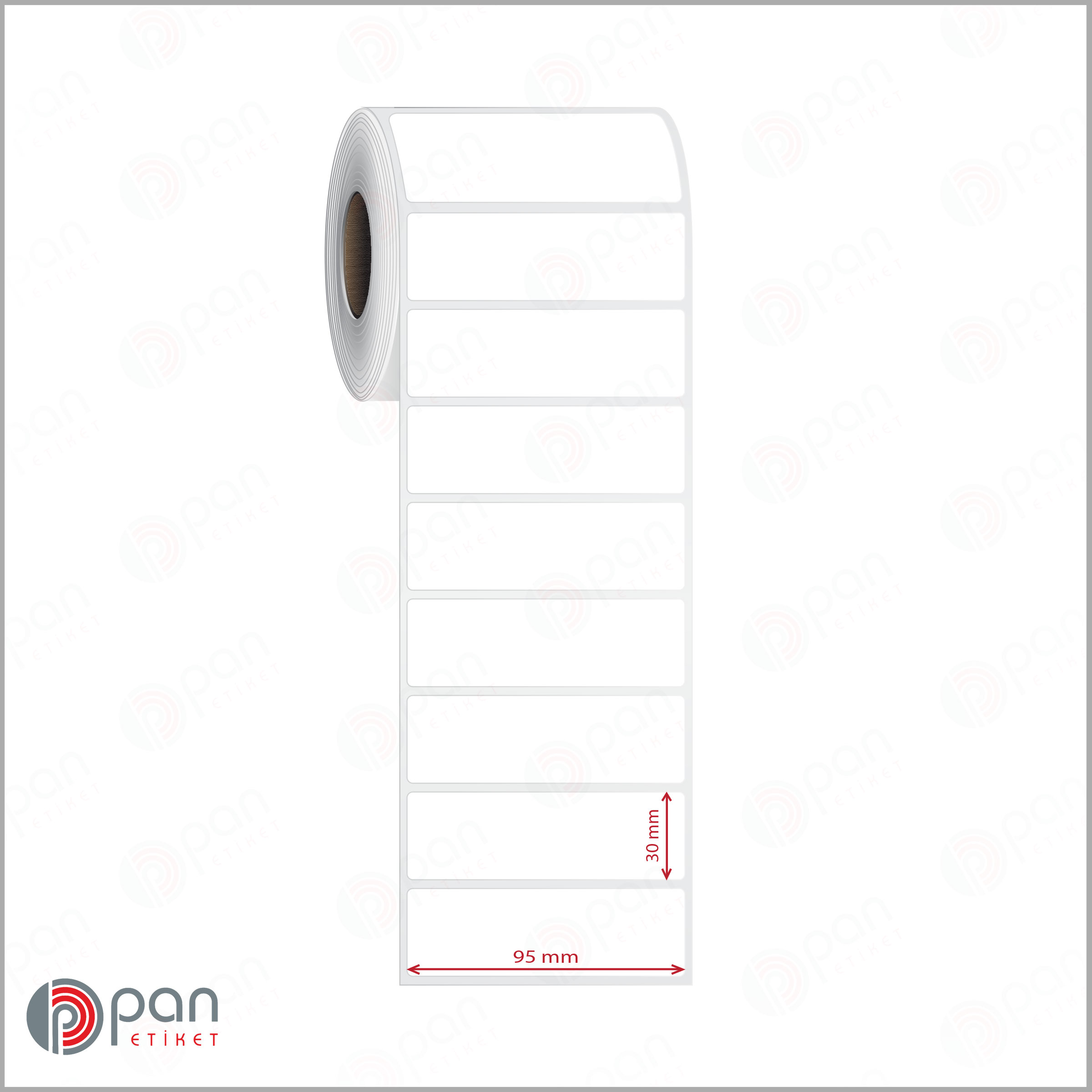 95×30 mm ölçülerindeki bu yapışkanlı rulo etiketin, rulo genişliği kenar boşlukları dahil ortalama olarak 99-101 mm ‘dir. Sipariş öncesinde barkod yazıcı cihazınızın bu genişlikte etiket rulosu kullanabildiğinden emin olunuz.